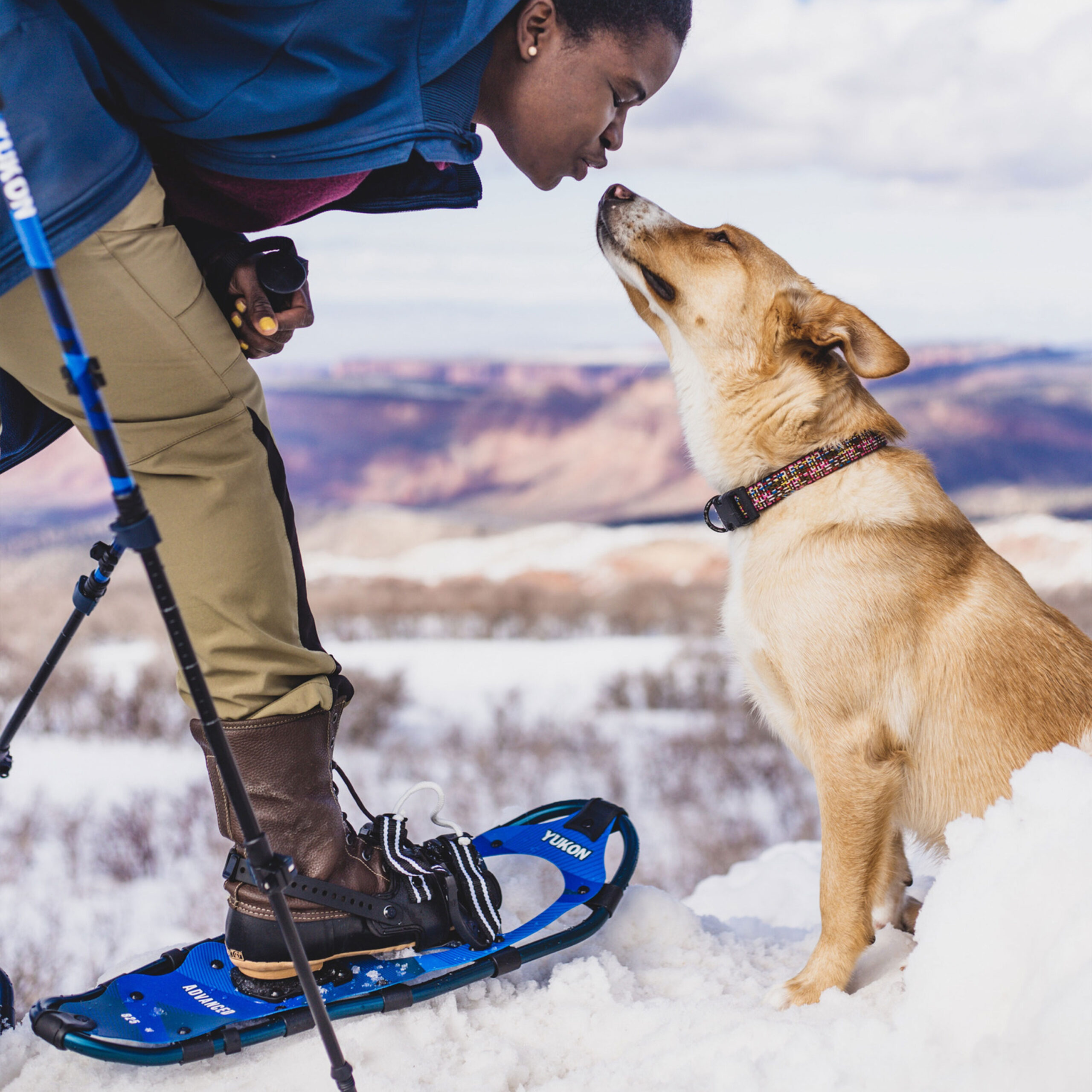 At every step the great webbed shoe sinks till the snow is level with the knee.