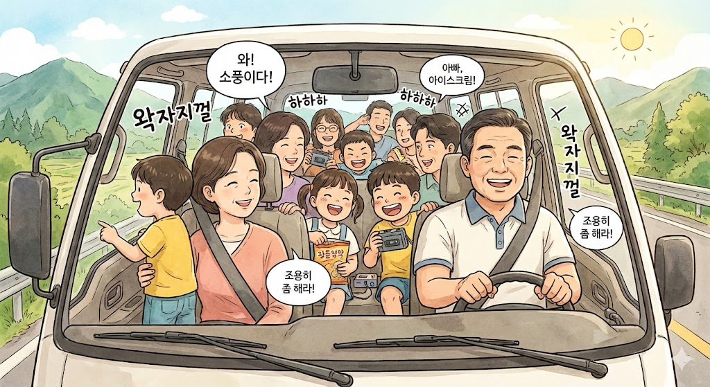 워낙 대식구다 보니 차 한 대로는 어림도 없었다. 둘째 매형의 봉고차를 필두로 여러 대의 차량에 나눠 타고 줄지어 여행길에 올랐다. 차 안은 우리 아이들과 조카들의 웃음소리로 꽉 찼고, 휴게소라도 들를 때면 마치 단체 관광을 온 것처럼 왁자지껄했다.