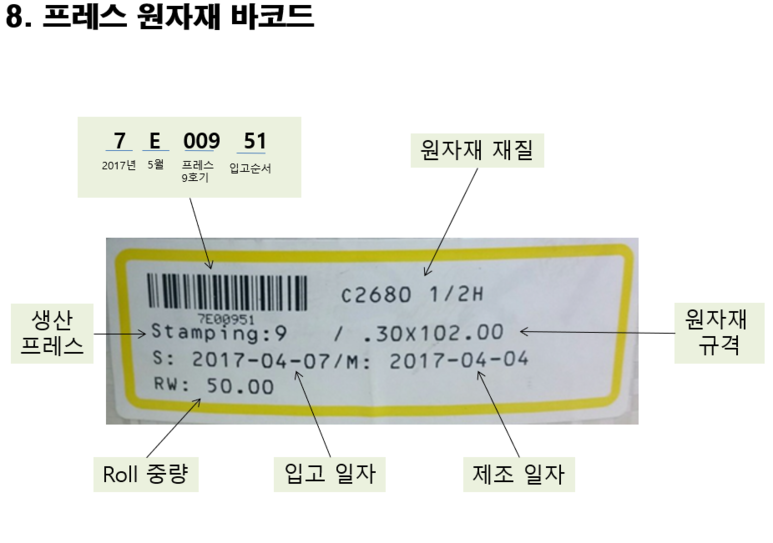 코드 체계의 구성요소는 프레스 생산 호기, 입고 일자, 생산일자, 원자재 재질, 롤(코일) 중량이다.