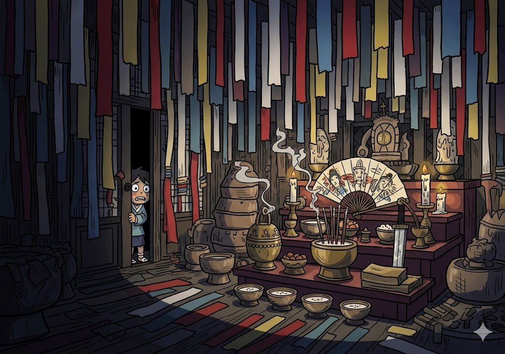 어느 날 아버지는 내 손을 이끌고 성남의 어느 무당집으로 향했다. 그곳에서 소개받은 분은 바로 그 집의 딸이었다. 어린 내 눈에 비친 무당집의 풍경은 공포 그 자체였다. 형형색색 걸려 있는 천들, 코를 찌르는 향 냄새, 그리고 나를 압도하는 기이한 분위기. 그곳은 나와 전혀 맞지 않는 세상이었다.